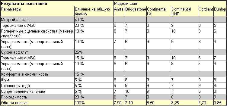 Примечание. Большинство покрышек имело маркировку «M+S», что говорит о возможности их круглогодичного использования. Однако мы намеренно не проводили испытания на зимних покрытиях, так как считаем, что для большинства российских регионов лучше подойдут специализированные зимние шины